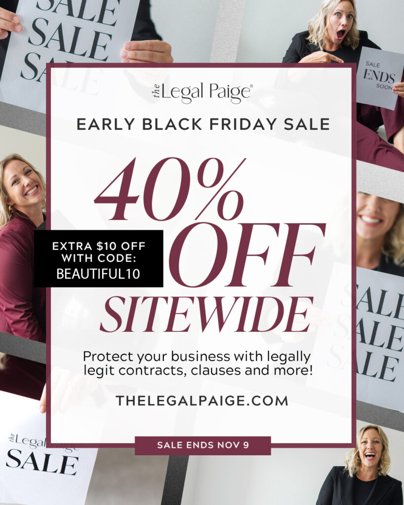 It’s time to ensure you are finally running a legally legit business by taking advantage of The Legal Paige’s Early Black Friday Sale! I’ve already got a few contracts in my cart and you should, too!